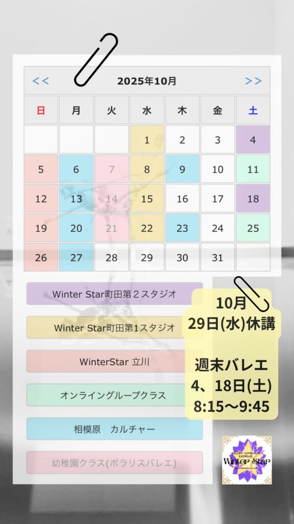 10、11月の休講日 10月29日(水) 朝バレエ、11月2日(日)サンデーバレエ