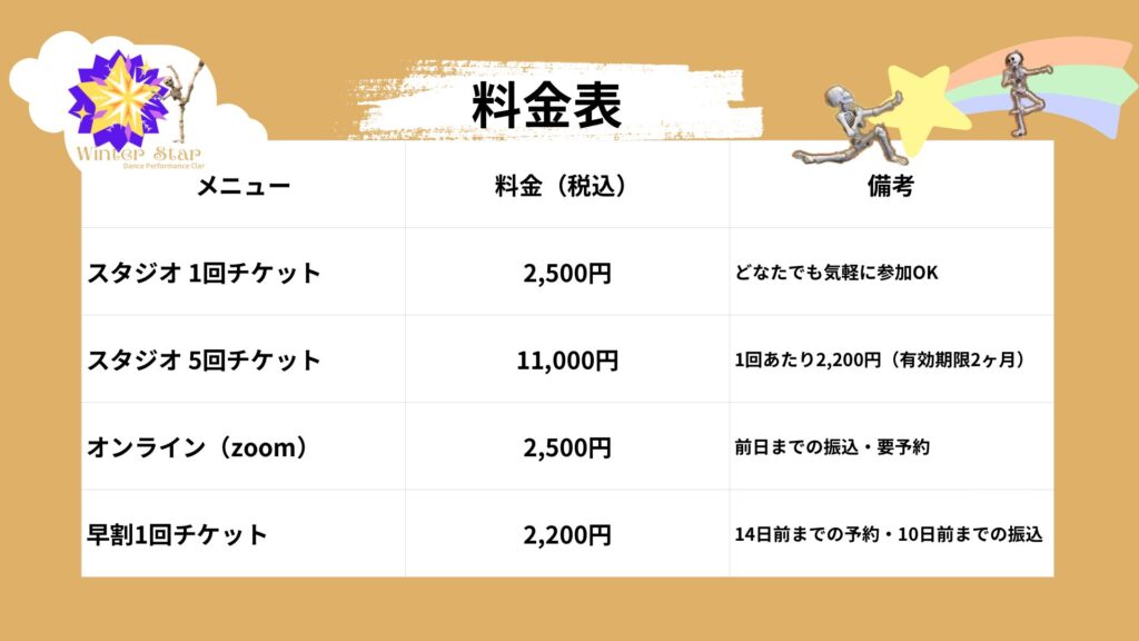 ・5回チケット…11,000円(Winter Star公式LINE登録の方のみ購入可/2ヶ月有効)